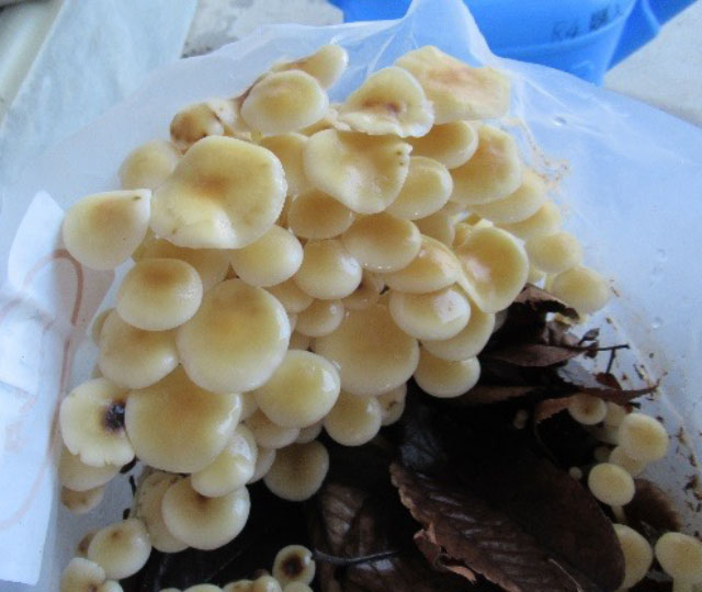 なめこ:密集して育つ。最初傘は丸いが、きのこが大きくなるにつれて平たくなる。11月下旬ころ、気温が低くなると一斉に成長し始めた。一袋につき3回ほど収穫できた。