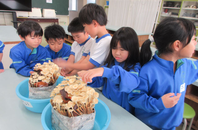 初めて収穫ができた時は、大きくて新鮮なしいたけがこんなにたくさん!!と感激しました。しいたけ・えのき共に、給食の先生が調整してくれて、しょうゆ炒めやおみそ汁、スープ、ハンバーグに入れて…など、みんなでおいしく頂くことができ、嬉しかったです。