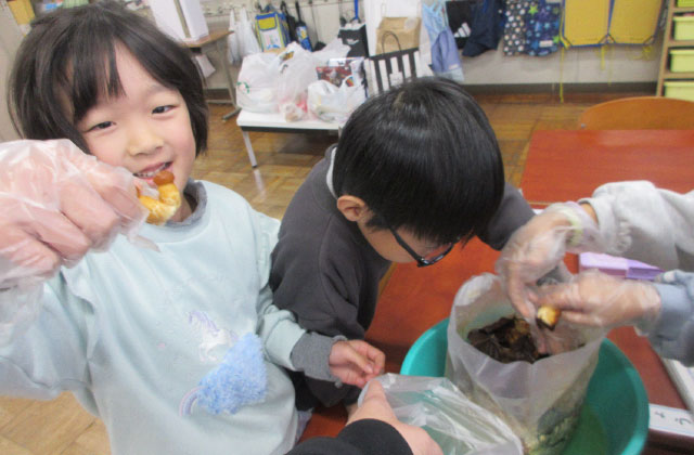 育てたきのこを数回に分けて各学年で収穫し、調理の先生に自分たちで持っていきました。(年長:ひらたけ、年中:しいたけ、年少:なめこ)あまりに大きいひらたけを収穫したときには大歓声が上がり、興奮した様子で周囲に見せ回っていました。